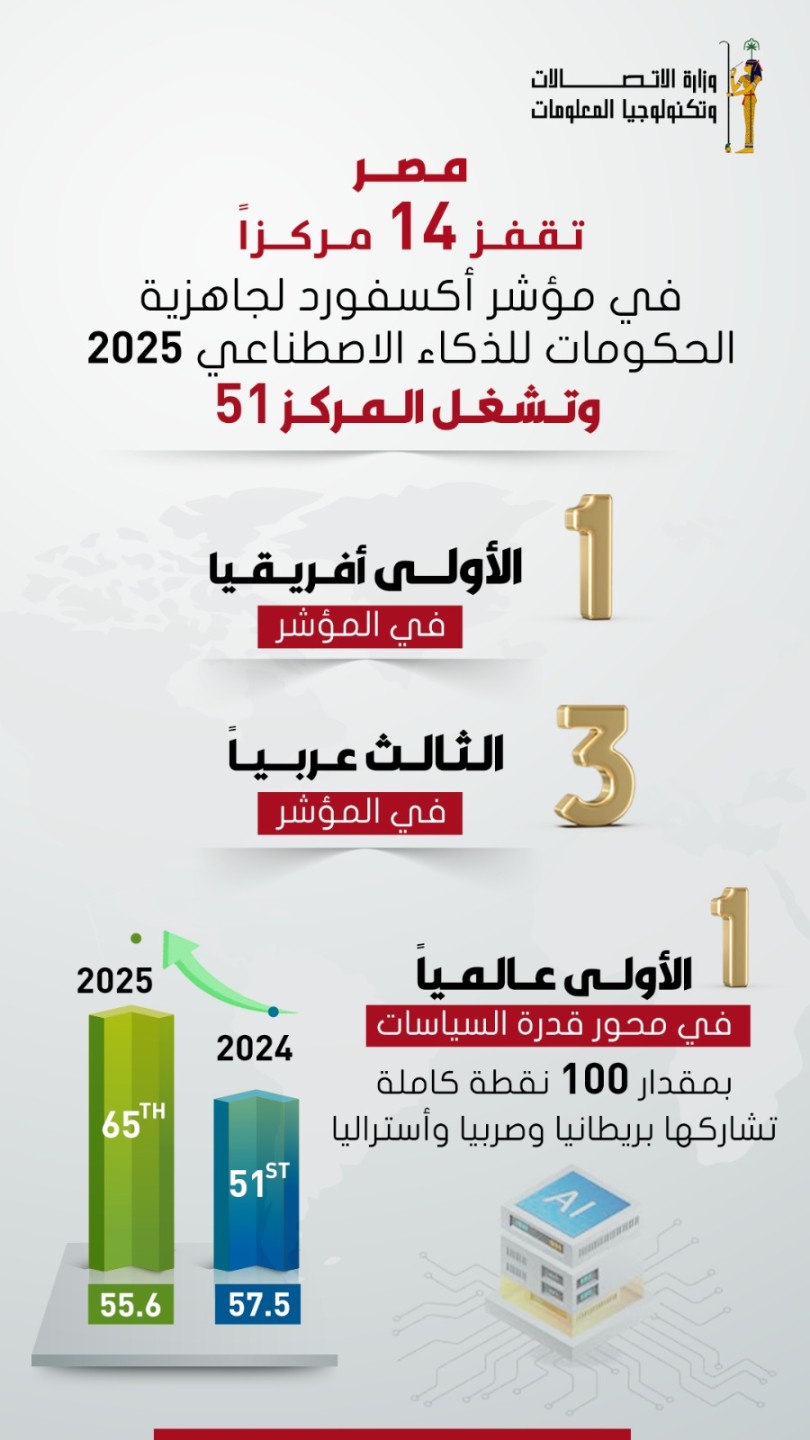 Egypt has ranked first in Africa in the 2025 Government AI Readiness Index, issued by Oxford Insights, advancing 14 places globally to secure 51st position worldwide among 195 countries.