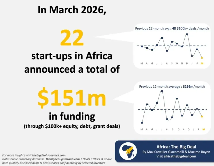 According to the latest data from Africa: The Big Deal, the African startup ecosystem exhibited a polarized performance in March 2026. While total funding surged to $151 million—nearly triple the amount recorded in March 2025—the number of deals plummeted to its lowest level since 2021, with only 22 startups securing funding. This "funding concentration" underscores a shift toward larger, late-stage transactions, leaving early-stage startups to navigate a tightening capital environment.